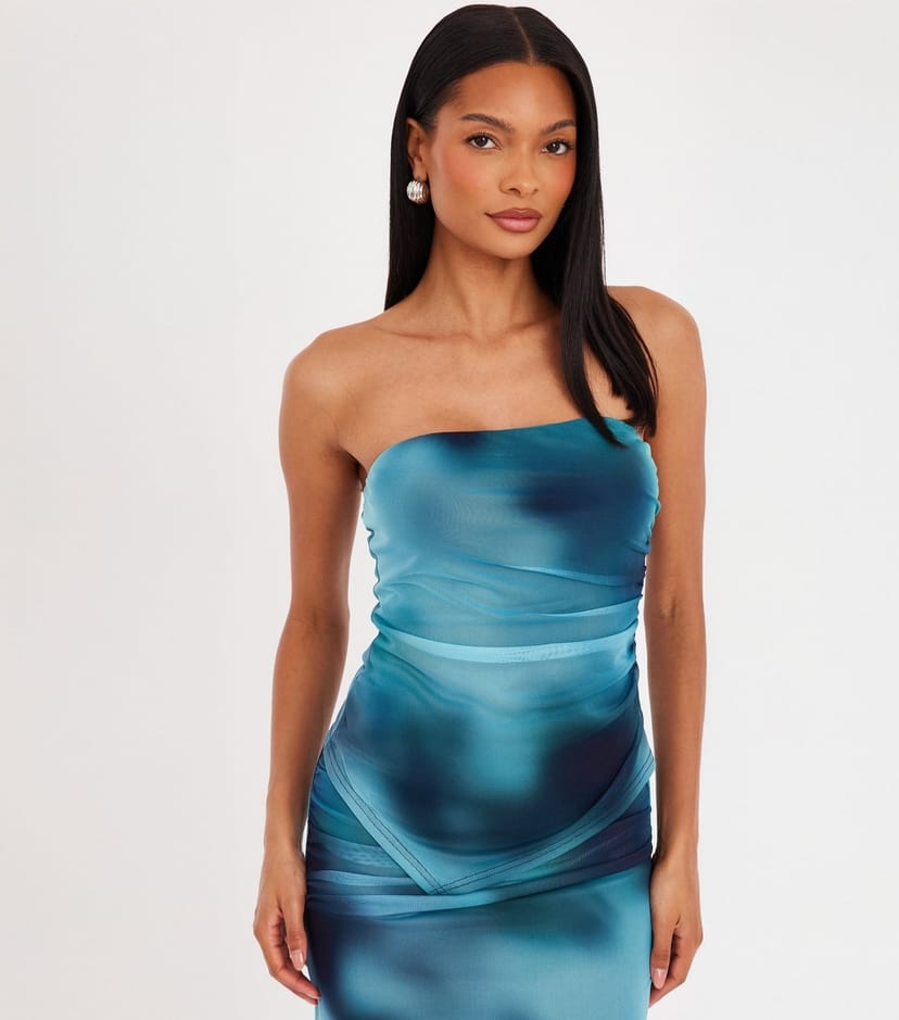 Striking teal asymmetric bandeau top in mesh fabric with a marble design. Slim fit and short length make it perfect for a trendy, effortless look.