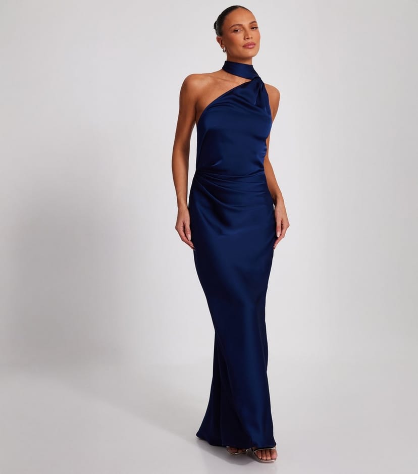 Stylish Navy satin maxi dress by Quiz featuring an asymmetric neckline and sleeveless design. The figure-hugging fit and gathered waist create a flattering silhouette. Ideal for evening events or special occasions.