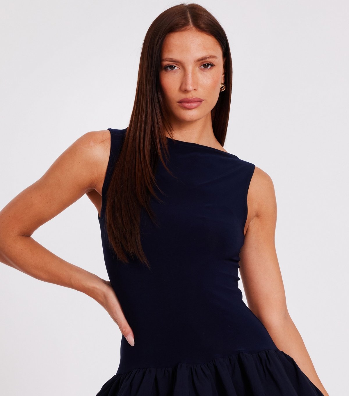 This navy sleeveless dress from QUIZ features a figure-skimming silhouette and a tiered ruffle mini skirt. Ideal for evening events or special occasions, it adds playful charm to your wardrobe.