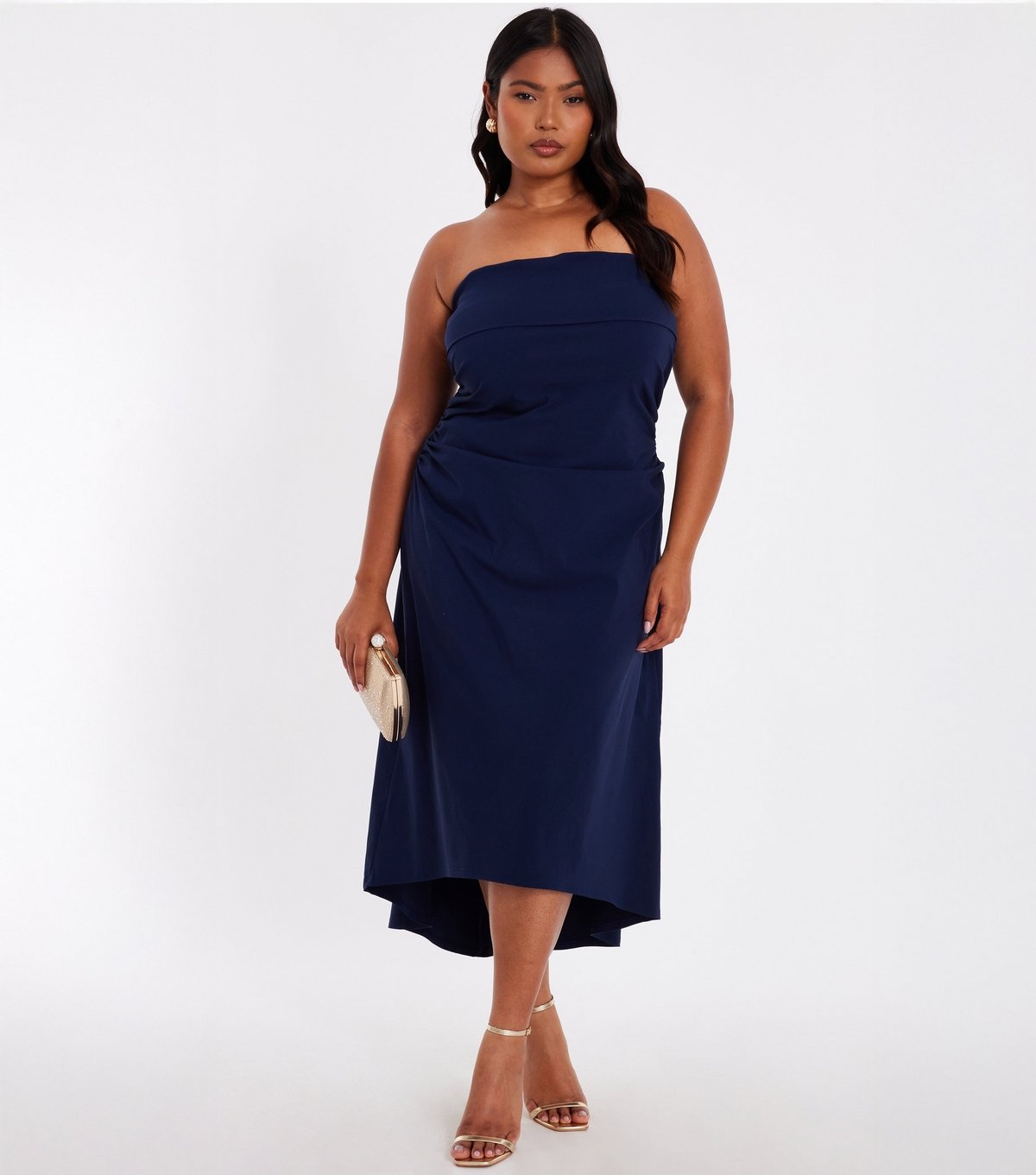 Effortlessly elegant navy bandeau midi dress from QUIZ Curves. The flattering ruched waist makes it perfect for evening events or special occasions.