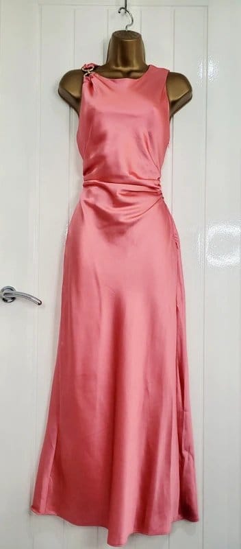 The Quiz Coral Satin One-Shoulder Evening Dress is available in sizes S.