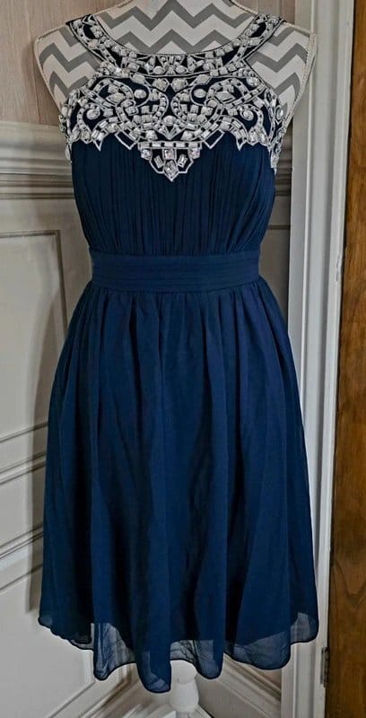 View Vinted's returns policyGorgeous navy blue chiffon cocktail dress from Quiz. Features jewel detailing on the top front and a shirred elasticated back for comfort. Perfect for evening events or special occasions.