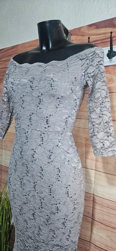 The Quiz Bardot Lace Dress with Fishtail Hem in Silver is available in sizes S.