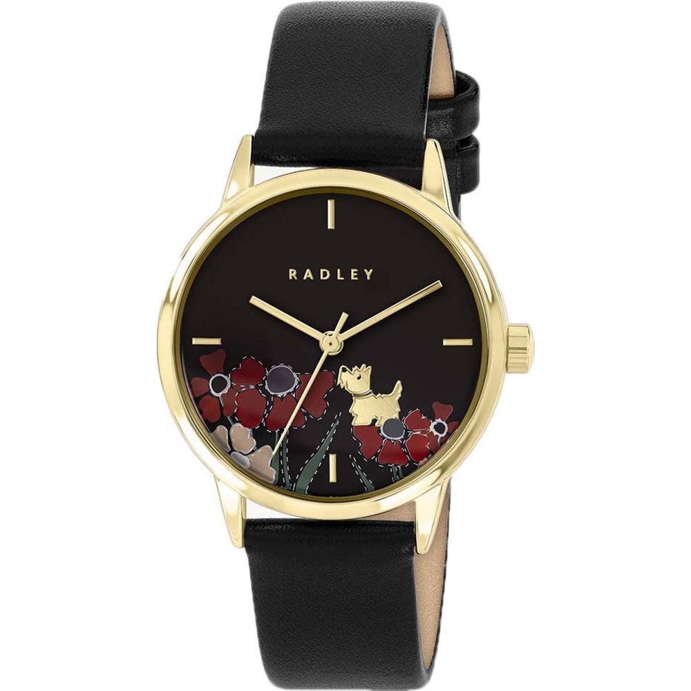 Stylish Radley ladies watch with a black leather strap and a floral dial. Features a gold-tone case and quartz movement. Ideal for everyday wear and special occasions.