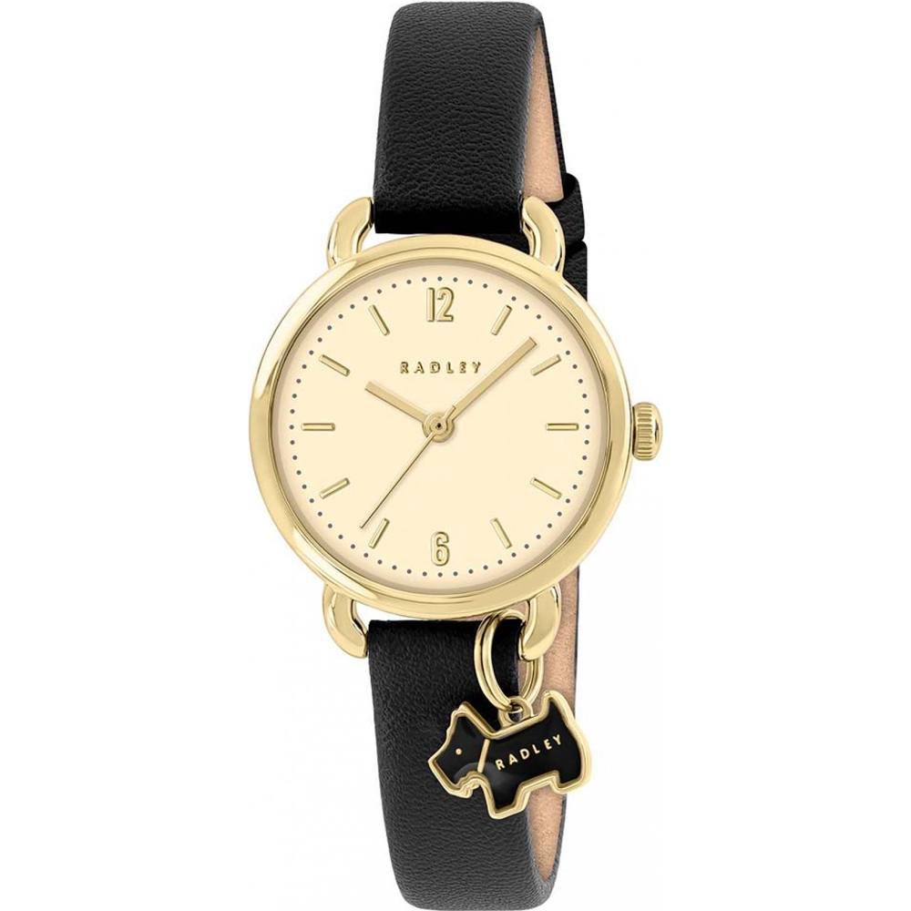 Stylish Radley watch with a black leather strap and gold-tone accents. Features a cream dial with gold-tone hands and Radley logo. Perfect for everyday wear.