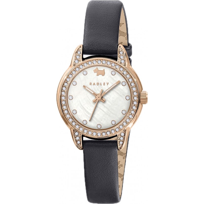 Stylish Radley RY21826 quartz watch for women, featuring a blue dial with crystal accents and a rose gold-tone case. The watch boasts a leather strap with a branded clasp, offering both elegance and durability.