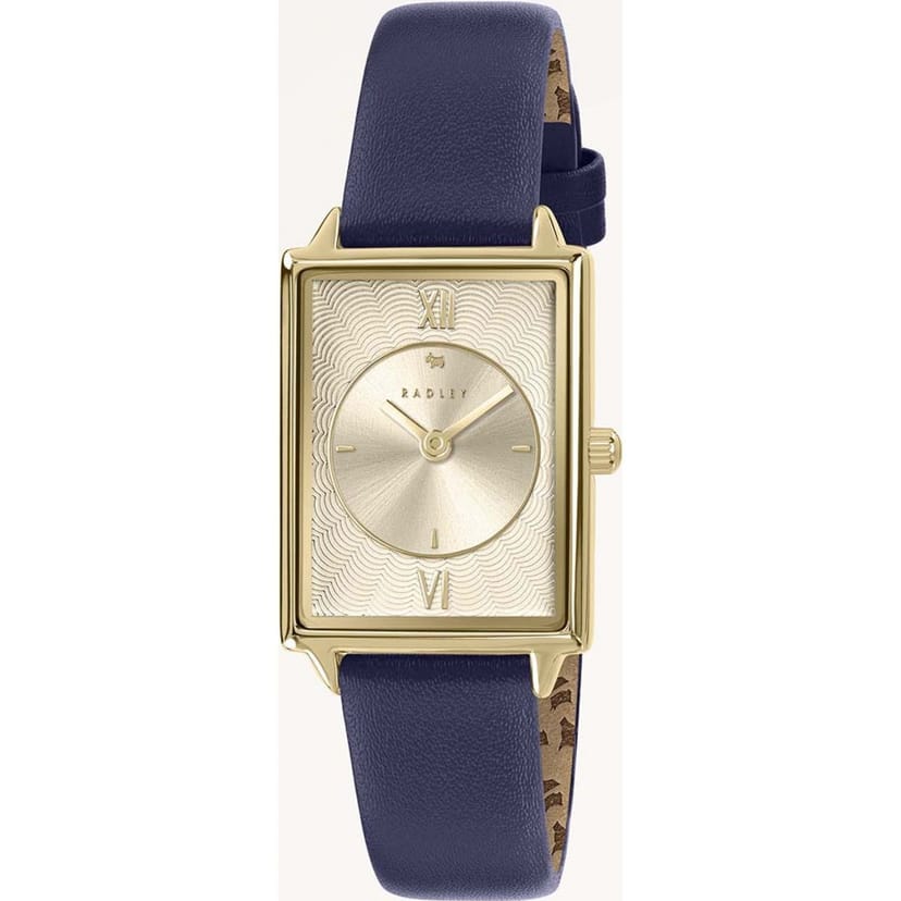 Stylish blue leather strap gold-tone case quartz movement watch from Radley. Perfect for everyday wear with its elegant design.