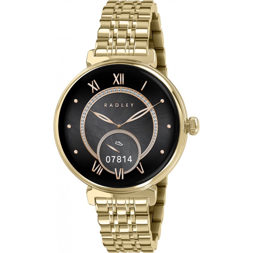 Elegant gold Ladies Series 48 Smartwatch by Radley. Features a black dial with crystal accents and a gold-tone metal bracelet. Perfect for any occasion.