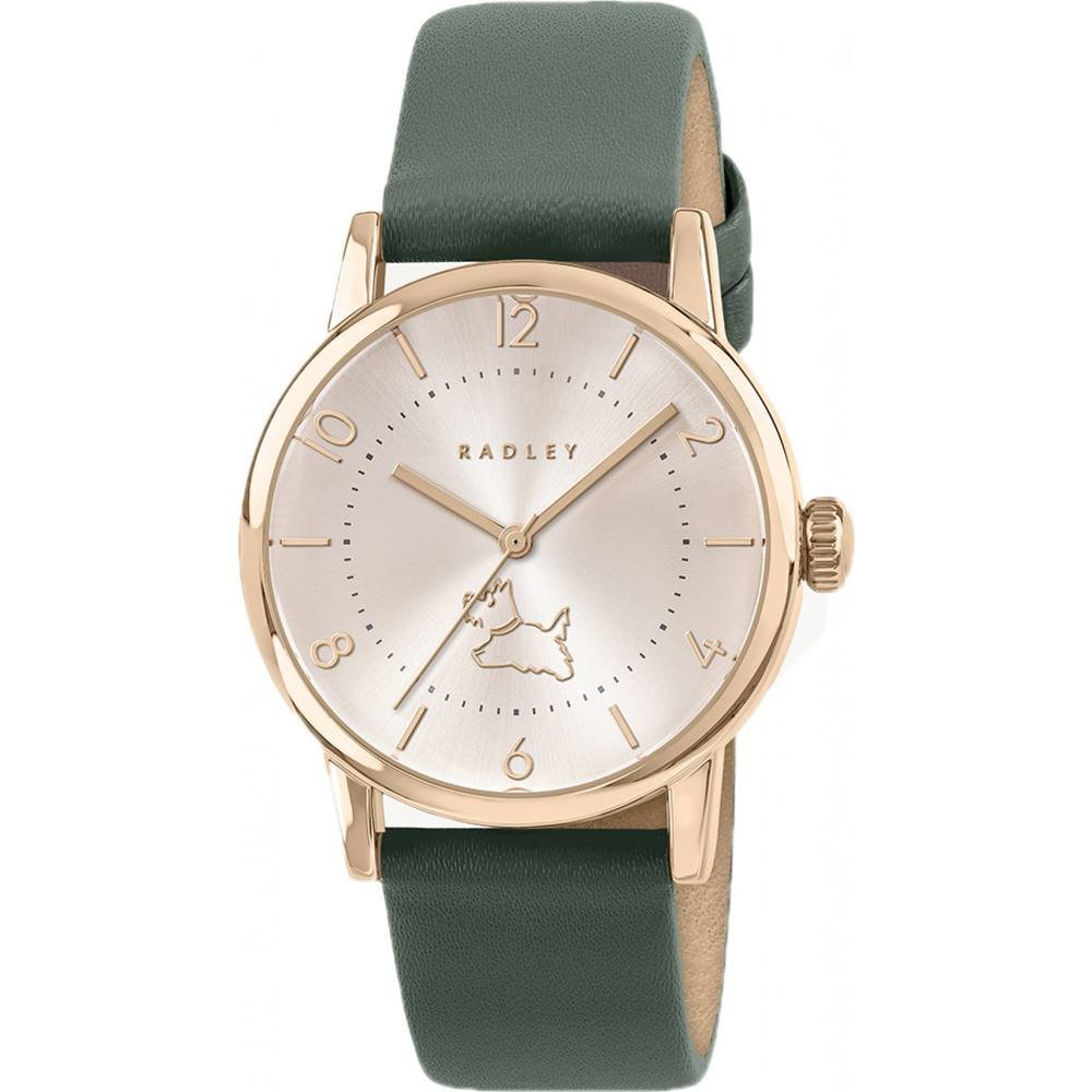 Stylish Radley watch with a green leather strap and a rose gold-tone case. Features a silver dial with a charming Scooter dog logo at 12 o'clock. Perfect for adding a touch of elegance to any outfit.