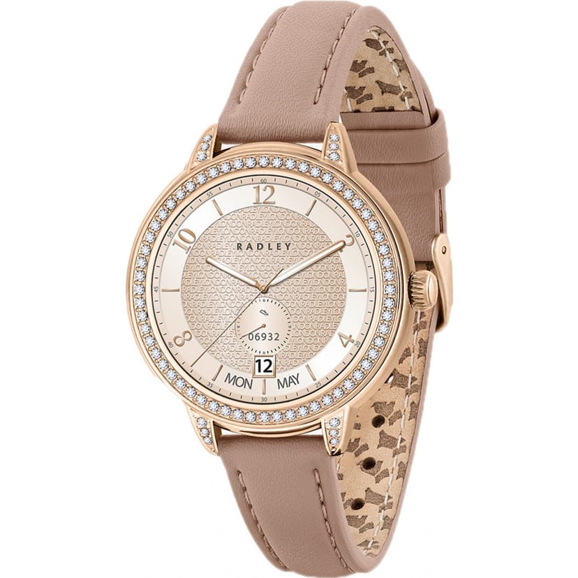 Elegant Radley watch with a rose gold-tone case and pink leather strap. The face is adorned with crystal accents and displays the day, date, and month. Ideal for adding a touch of luxury to any outfit.