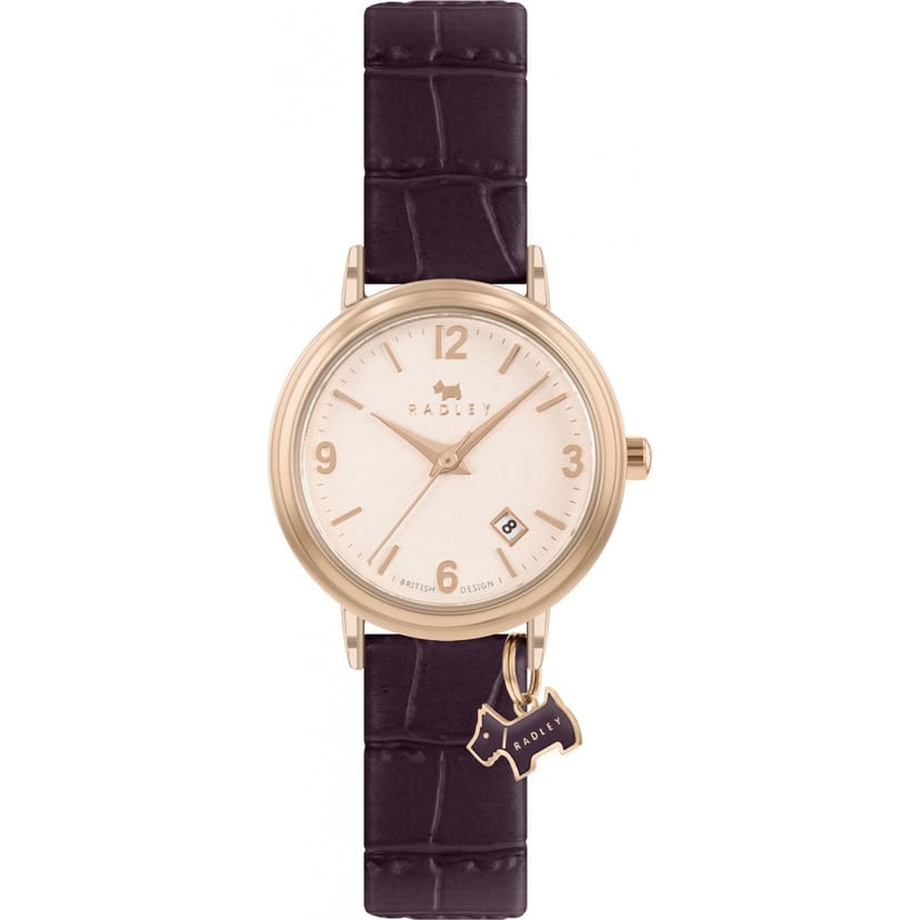 Stylish Radley watch in purple with a rose gold-tone case and cream dial. Features a leather strap and brand logo charm, perfect for everyday elegance.