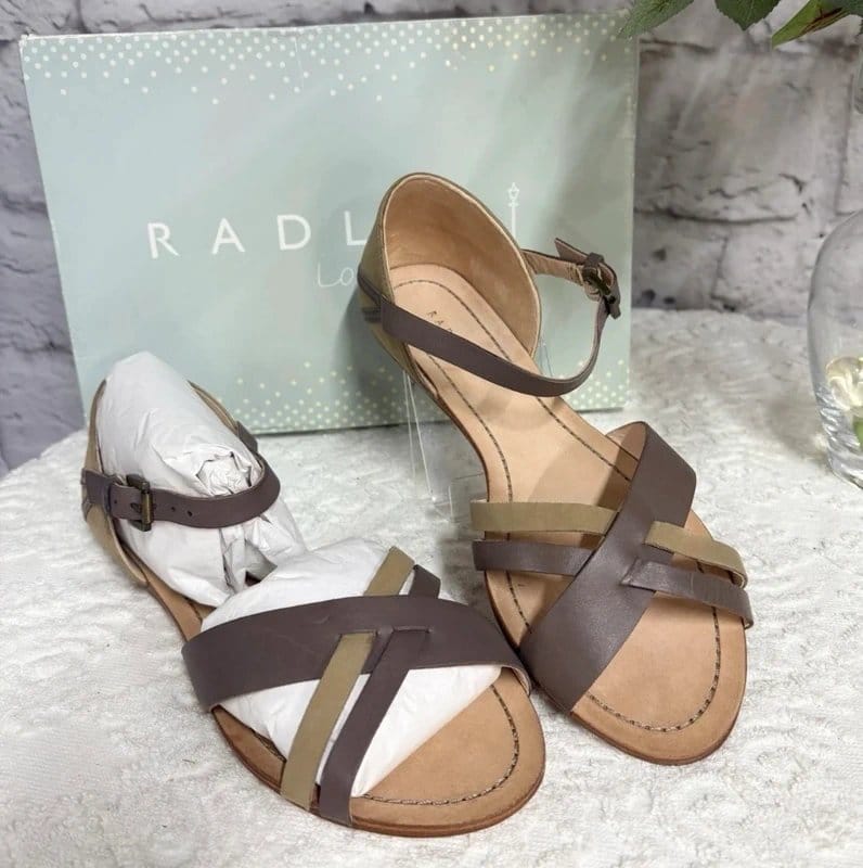 Stylish Radley flat sandals in khaki and brown leather. Featuring intricately woven straps and signature leather craftsmanship, these sandals are perfect for casual outings.