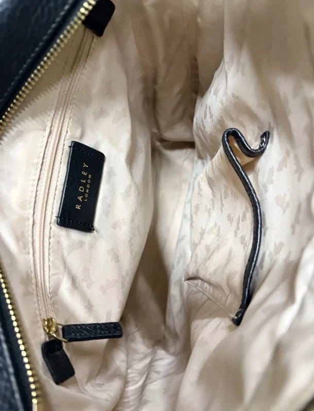 A pre-owned Radley Borough Mews tote bag in black leather. Immaculate condition with light usage creasing. Features a spacious interior and multiple compartments.