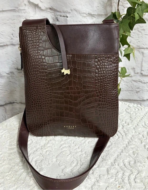 Crafted in an embossed Moc Croc printed leather in a Dark Rich Red brown shade with a full leather strap which is adjustable. The Interior is the Radley classic branded jacquard lining in beige. The bag closes with a top zip and features a gold foil print logo and a 3D metal Scottie dog charm matching the gold hardware.