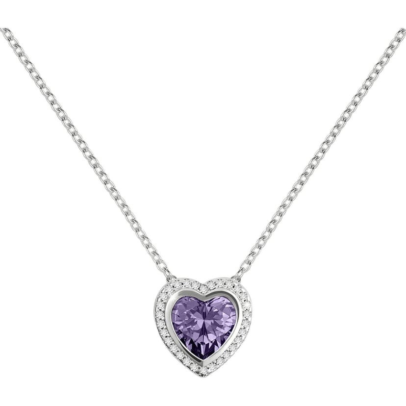 Elegant heart-shaped necklace from Radley, featuring a sparkling purple gemstone surrounded by a halo of diamonds. Crafted in silver, it's a perfect accessory for any occasion.