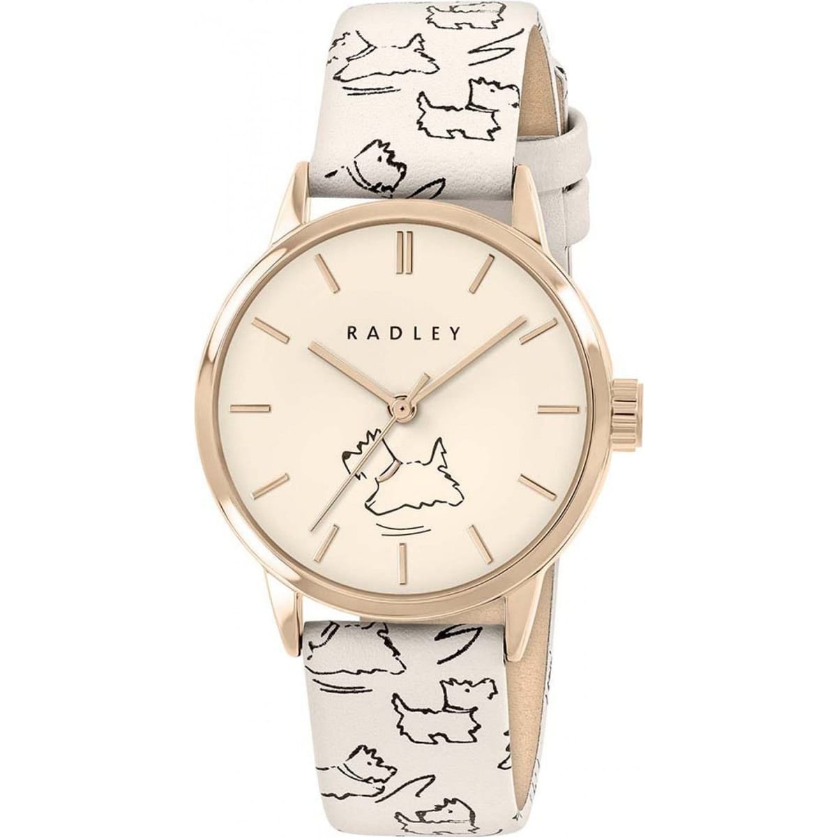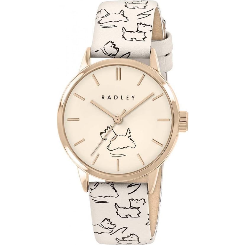 A white quartz watch from Radley, featuring a cream leather strap with a playful Scottie dog print. The rose gold-tone case and cream dial add a touch of elegance. Ideal for any occasion.