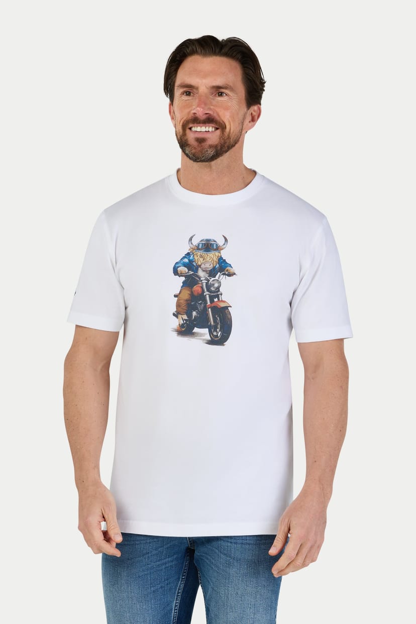 Classic white t-shirt with a bold biker bull graphic. Made from high-quality cotton for comfort and durability. Perfect for casual wear and easy layering.