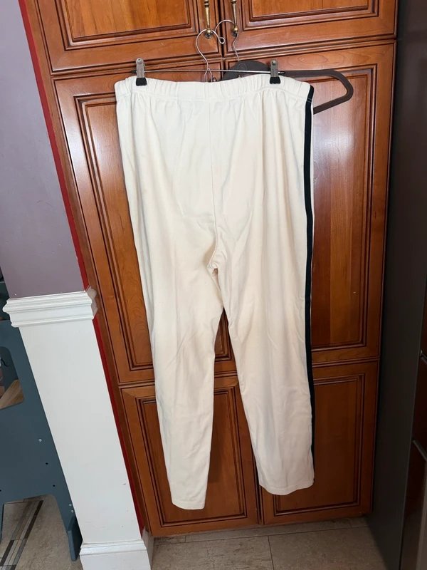 Stylish cream cotton sweatpants with bold black accents. Comfortable and versatile for any casual occasion. Designed with cream, full-length, elastic waistband, cotton, straight fit, zipper closure.