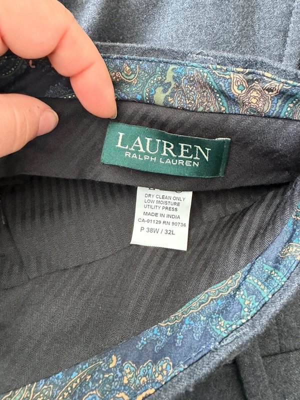 The Ralph Lauren Grey Wool Dress Pants is available in sizes L.