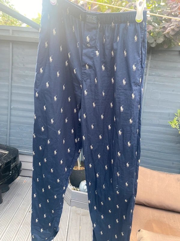 The Ralph Lauren Navy Print Trousers with Polo Logo is available in sizes S.