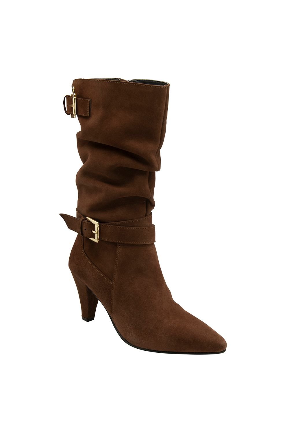 Chic brown suede mid-calf boots with a ruched design. Featuring buckle detailing on the top collar and ankle, these stiletto-heel boots have an almond toe and an 8cm heel. Perfect for making a subtle yet stylish fashion statement.