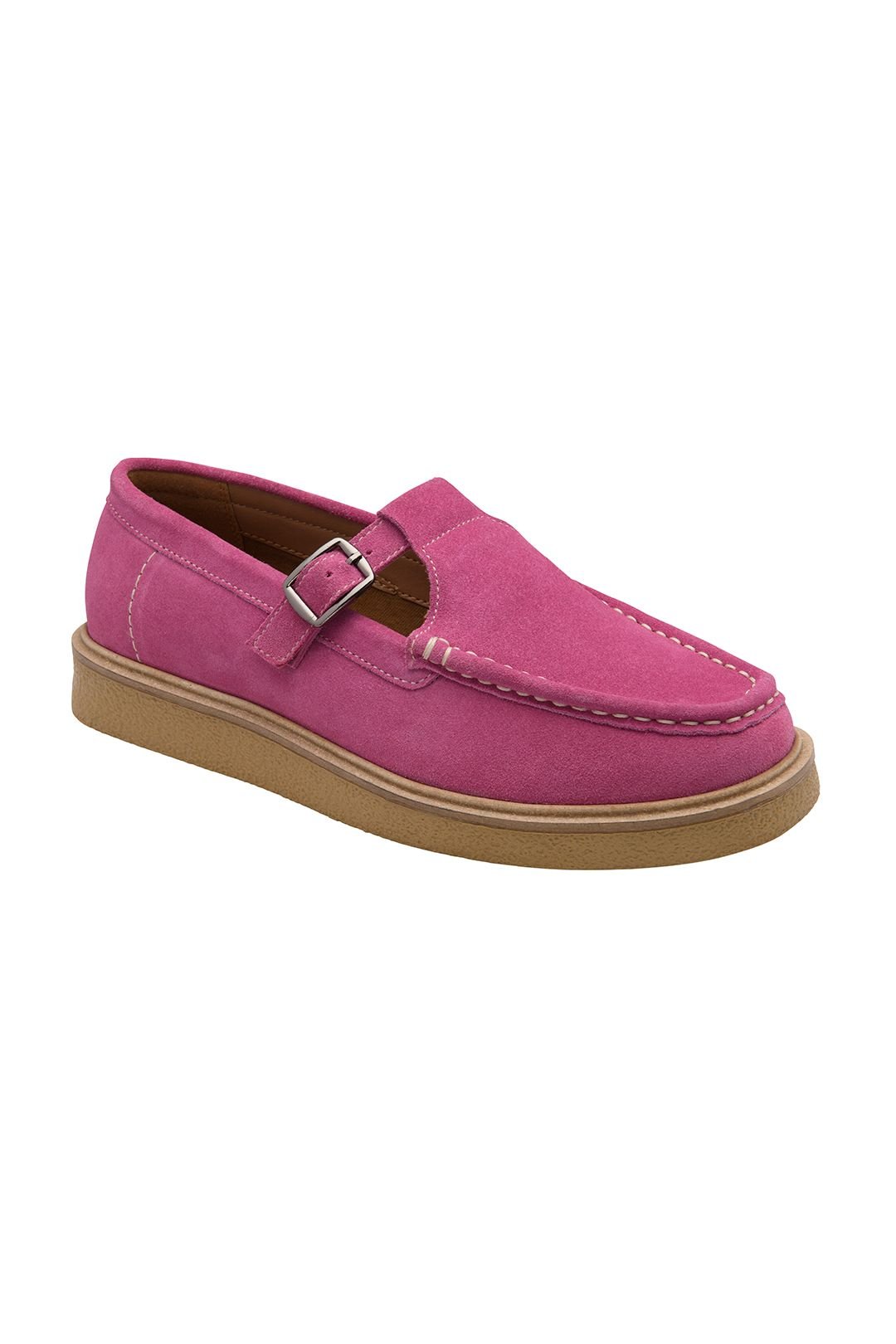 Elegant Fuchsia suede loafers by Ravel, designed for understated elegance. Featuring a sleek apron toe, subtle strap fastening, and a gently structured shape. Perfect for a quietly elevated look.