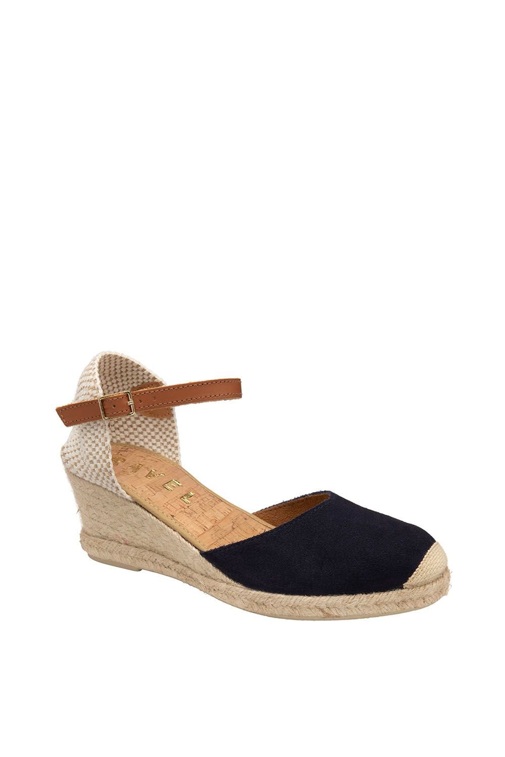Stylish Navy suede wedge espadrille sandals by Ravel. Featuring a 6cm wedged heel, plaited trim, woven heel panel, and adjustable ankle strap. Perfect for summer wear.