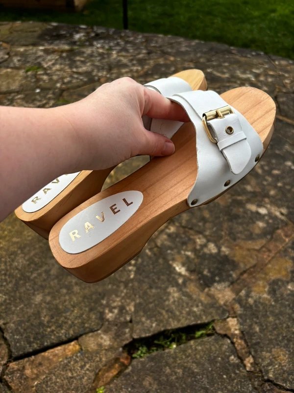 The Ravel Peyton White Leather Clog Sandals is available in sizes S.
