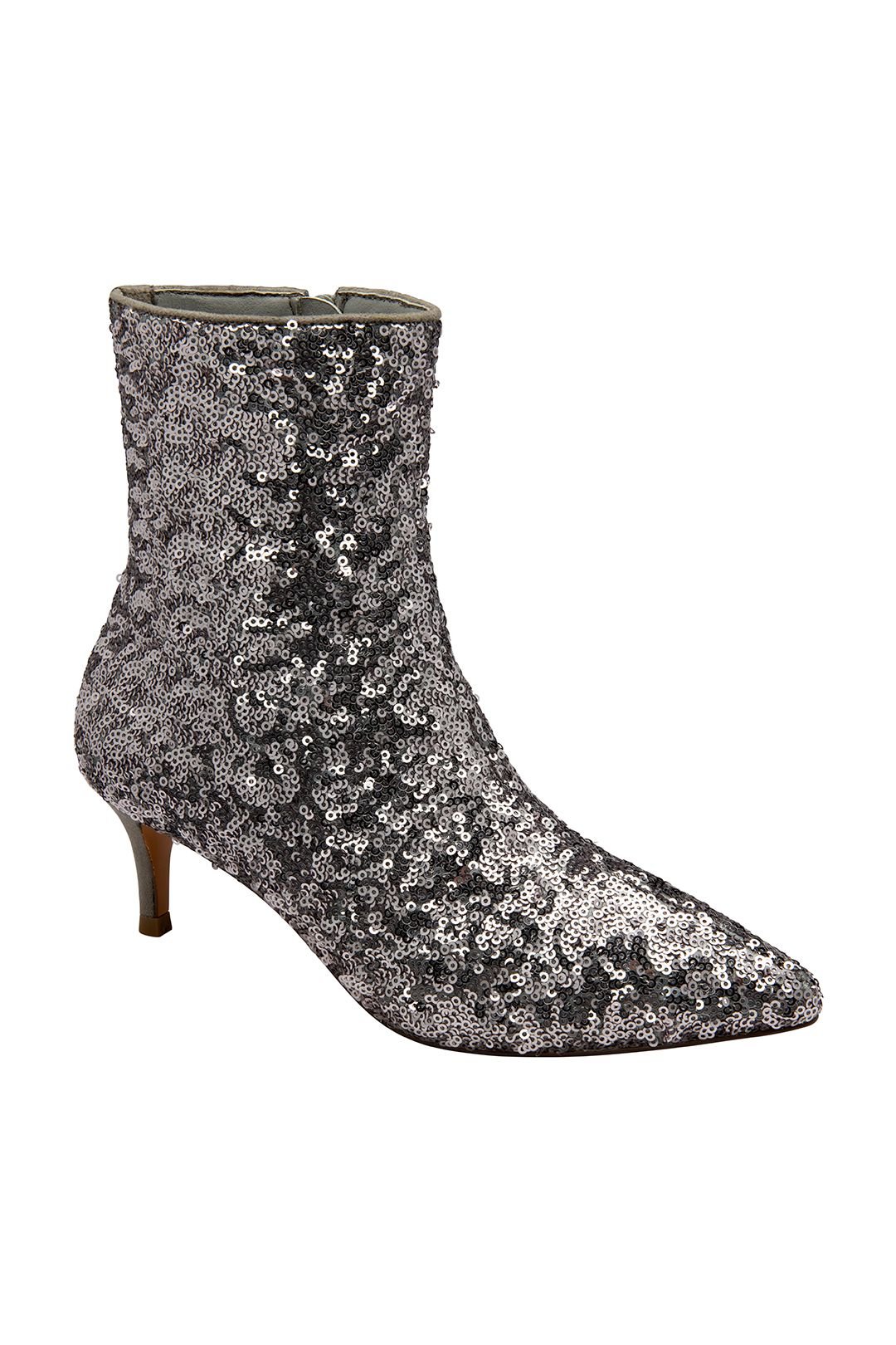 The Ravel Silver Sequin Kitten Heel Ankle Boots is available in sizes 4, 5, 6, 7.