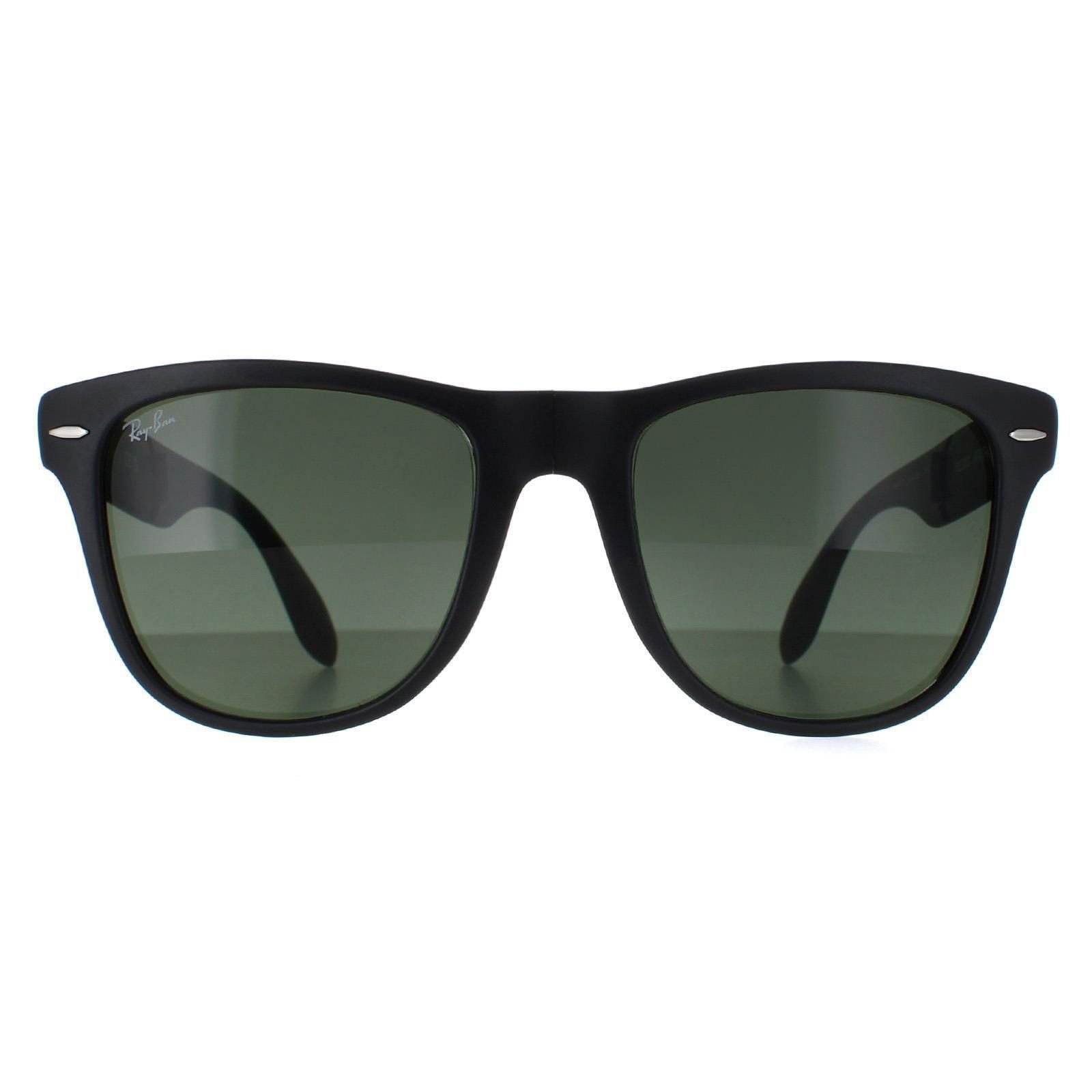 Iconic Ray-Ban Wayfarer sunglasses in matt black with green lenses. Featuring a foldable design and angular frame, these are perfect for a stylish and versatile look.