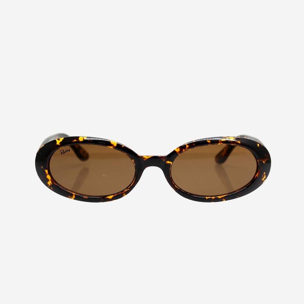Retro-inspired REALITY EYEWEAR sunglasses with a narrow and refined style. Featuring a brown tortoiseshell frame and robust polycarbonate lenses with Category 3 UV protection. Perfect for a vintage chic look.