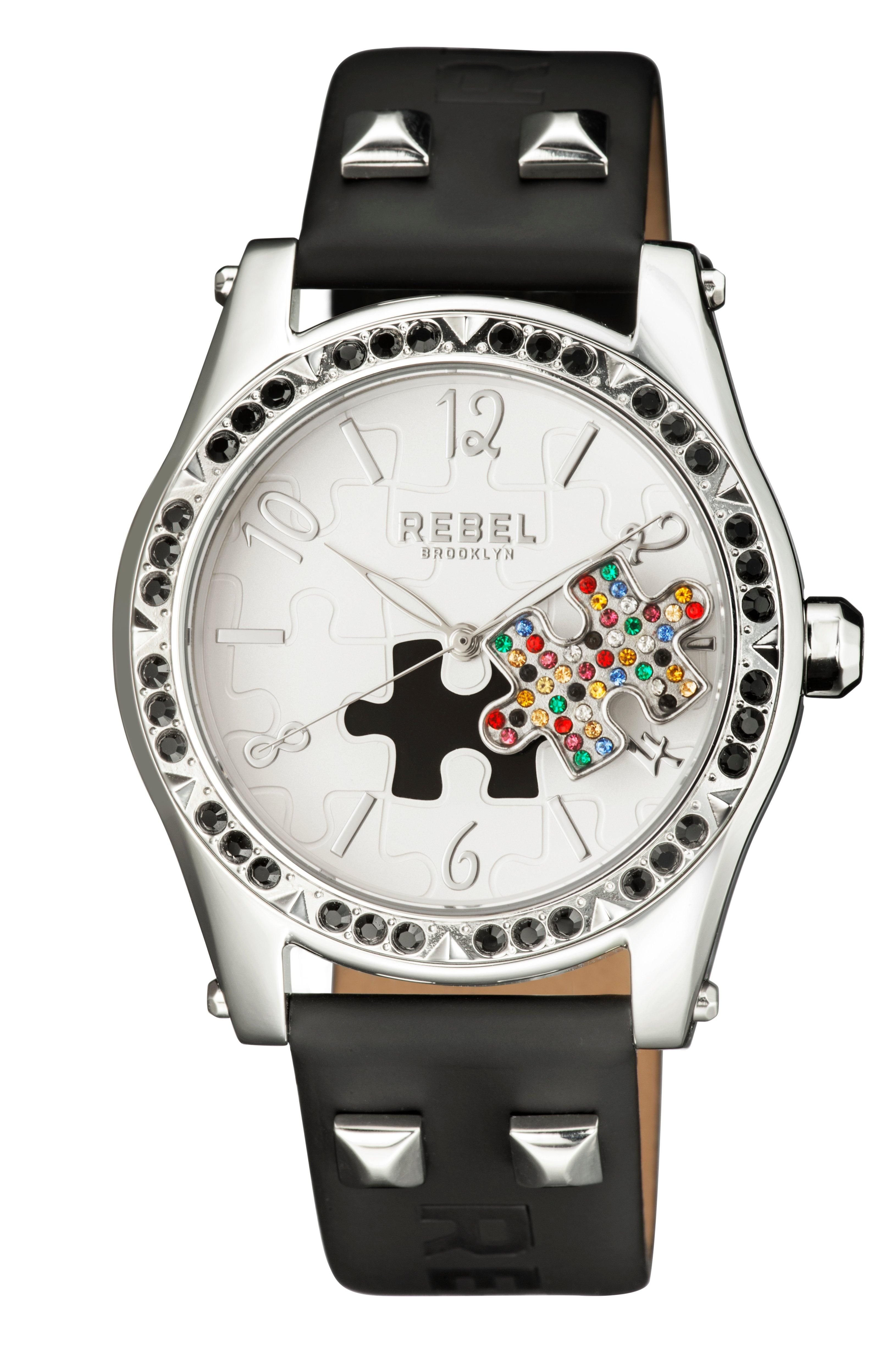 Stylish Rebel Gravesend watch for women, featuring a black leather strap and a silver-tone dial adorned with a puzzle piece design. Perfect for adding a touch of edginess to any outfit.