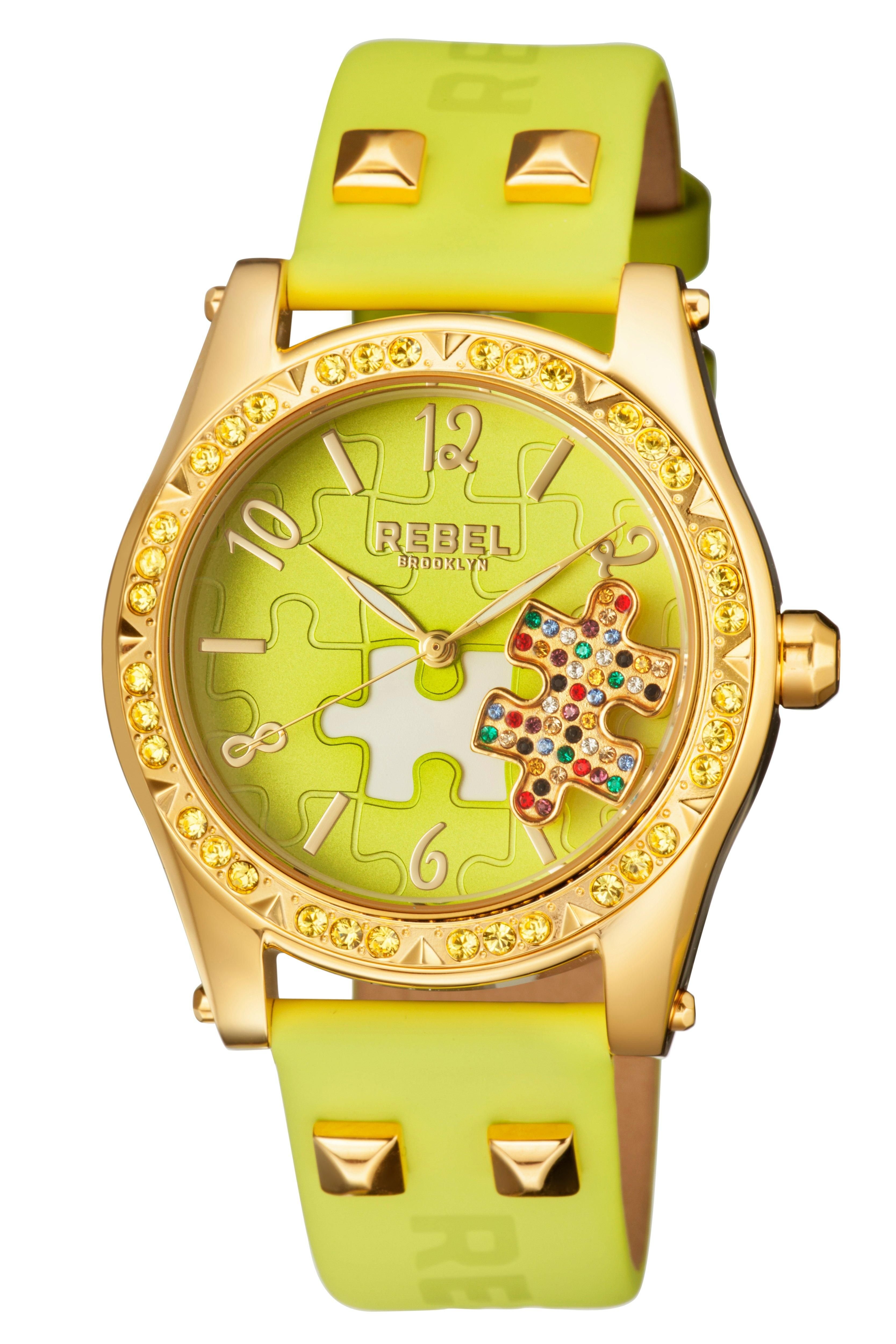 Bold lime green dial watch with a puzzle embossed face and crystal embellishments. Features a gold-tone casing and lime green leather strap. Perfect for making a statement.