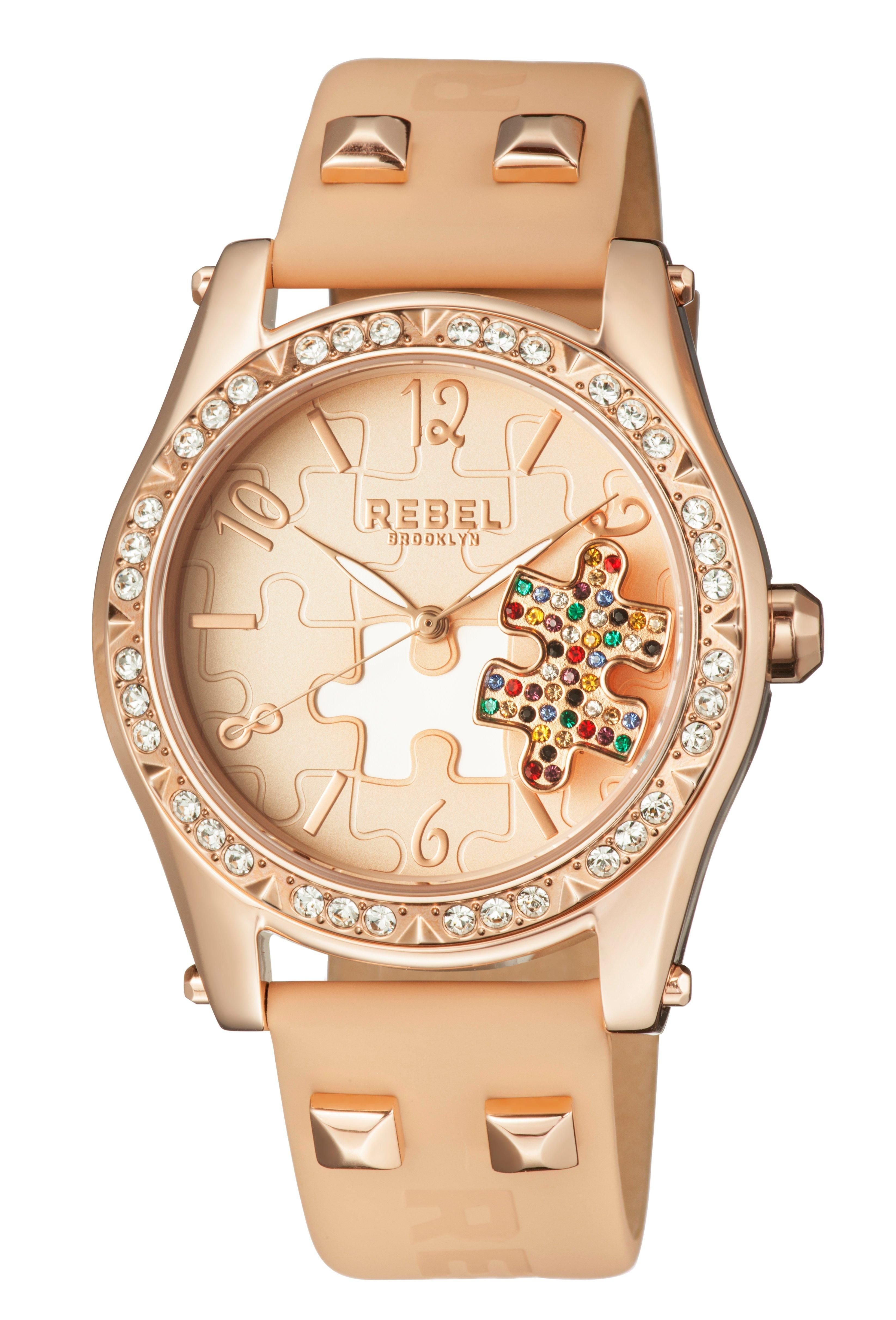 Stylish Rebel Gravesend watch for women, featuring a tan dial and puzzle embossed face. Adorned with multi-colored crystals and a leather strap, this watch is a statement piece.