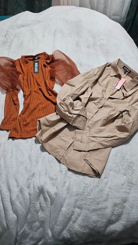 This top bundle in size S features a ribbed mesh sleeve top and a Missguided beige button-up shirt. Perfect for smart casual outfits, layering, or everyday wear.