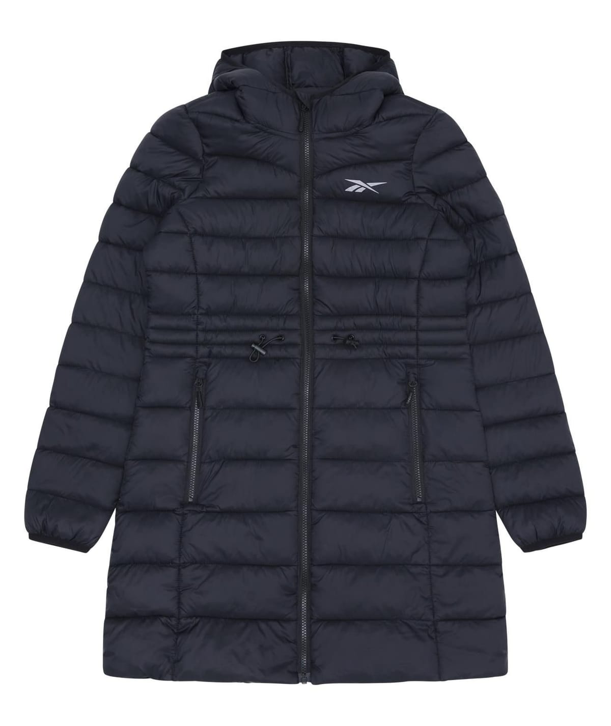 This long-length padded jacket provides extended coverage in colder weather. Horizontal quilting locks in heat, while a cinched waist adds shape and definition. The jacket features zipped side pockets, a full-zip closure, and a hood. Made with a smooth polyester shell, it's soft yet protective.