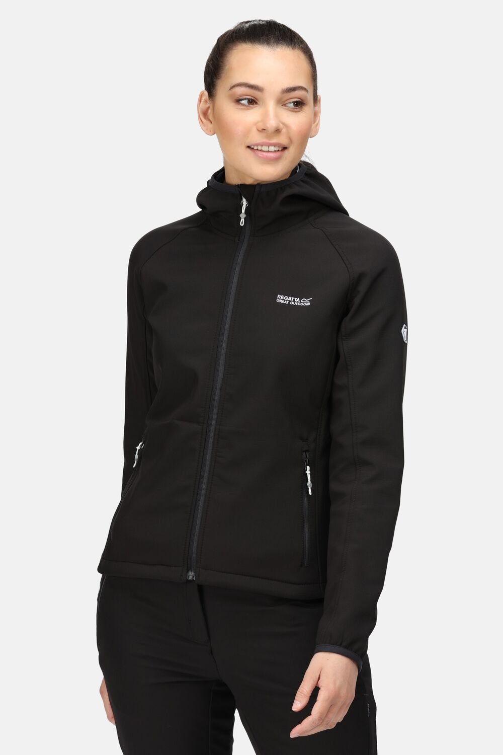 The Regatta Women's 'Arec III' Wind Resistant Jacket in Black is made from softshell, polyester.