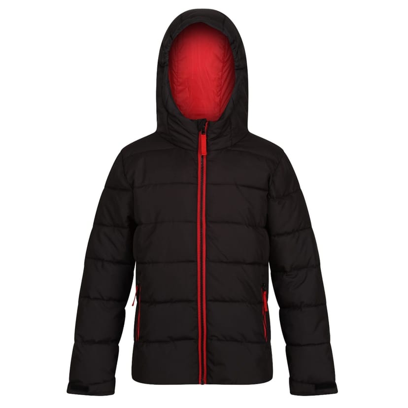 See all outfit ideasStylish Regjun men's jacket in black with a hooded neckline. Features a full-length zipper, quilted pattern, and red accents. Perfect for cold weather with its thermal insulation and waterproof properties.