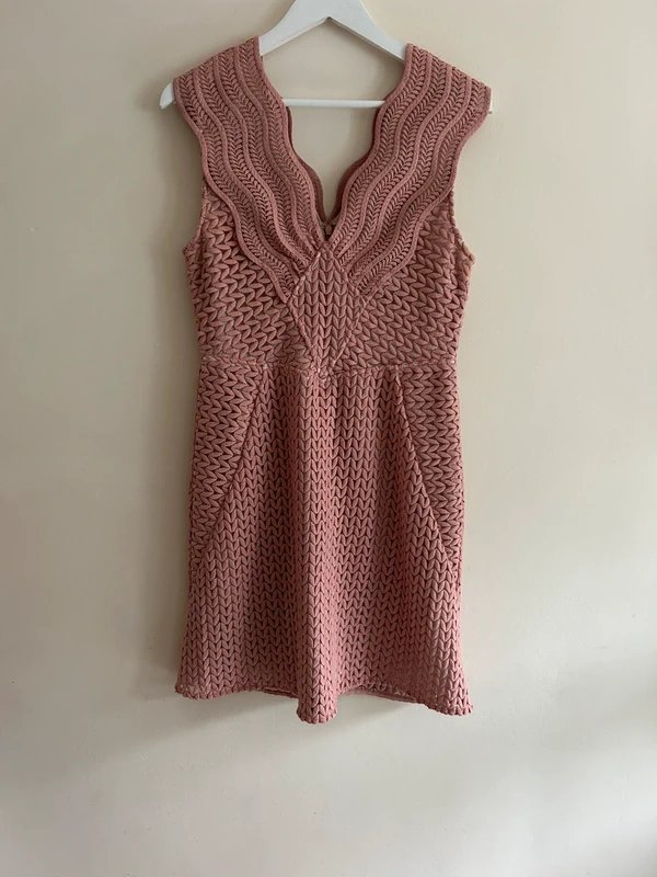 The Reiss Blush Pink Textured Crochet Sleeveless Mini Dress is available in sizes M.