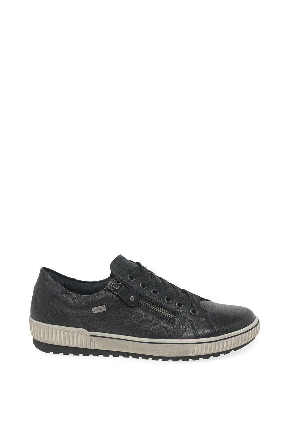 Stylish black leather trainers by Remonte featuring a Tex membrane for water resistance. The laces and side zip ensure a perfect fit, making them ideal for everyday wear.