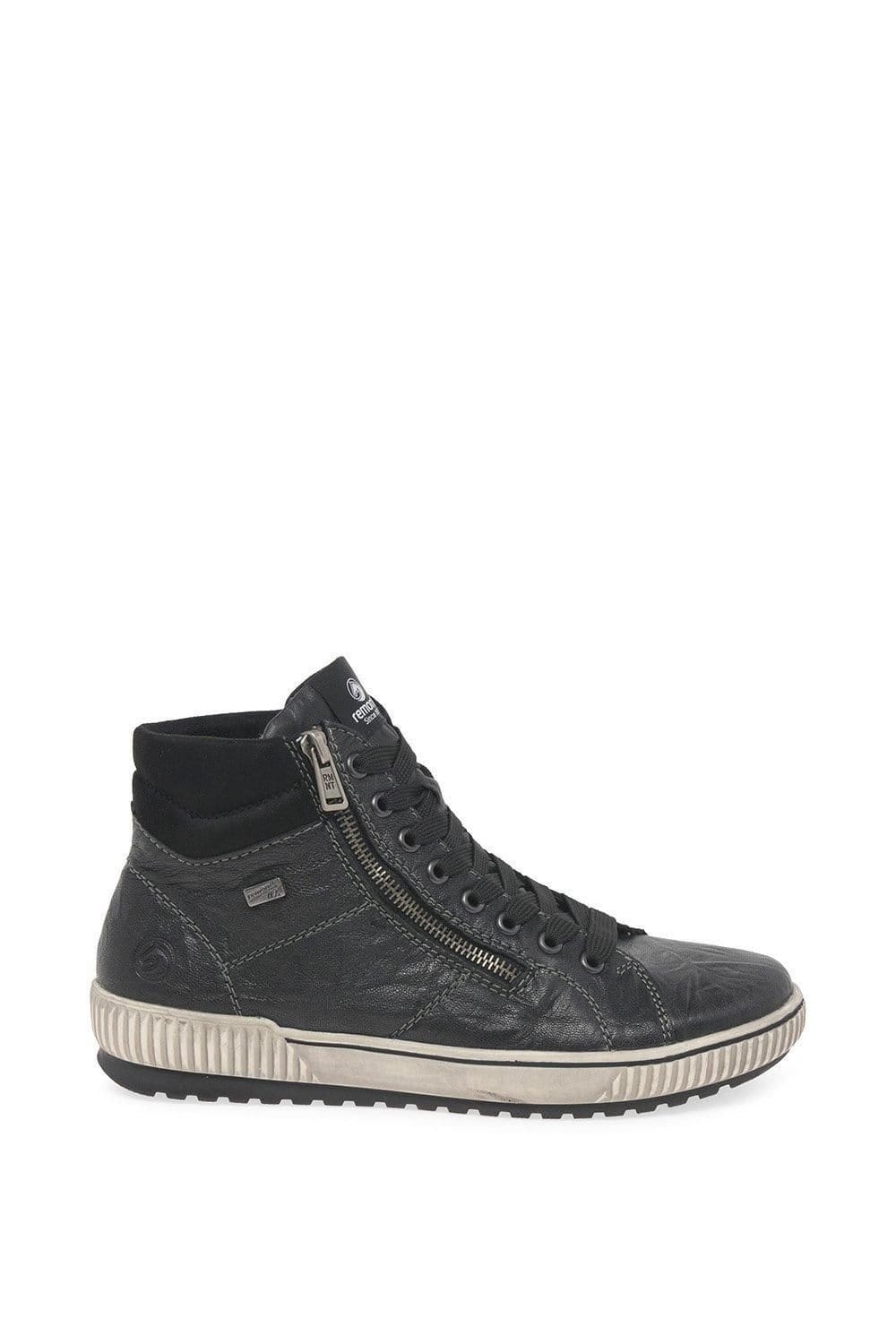 Casual and sporty black leather ankle boots from Remonte. Featuring a trainer-style profile, padded cuff, and water-repellent lining for comfort and protection.