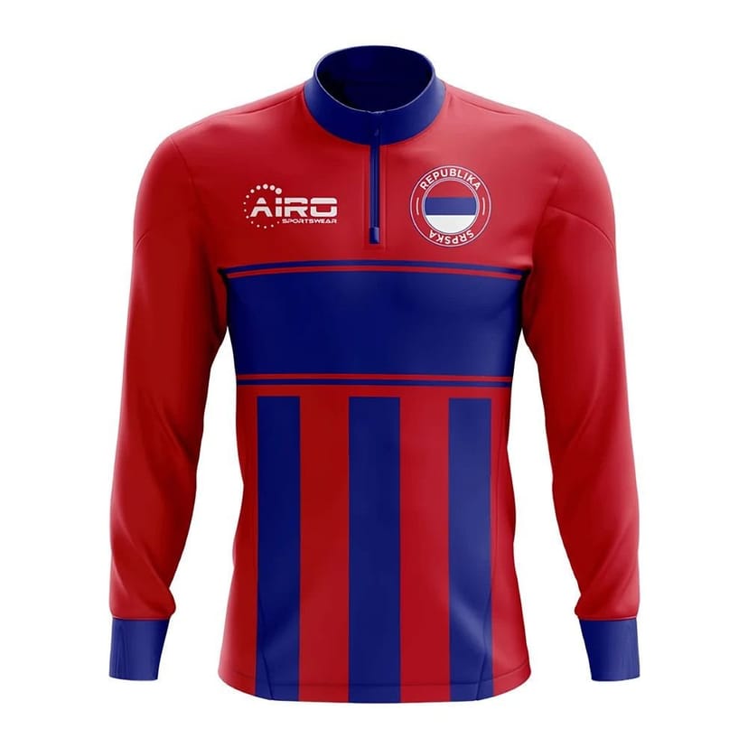This Republika Srpska football half zip midlayer top is crafted from a stretchy lycra-type material for added warmth and comfort. The red and blue striped design showcases the Republika Srpska national team's colours. Ideal for training sessions or casual wear.