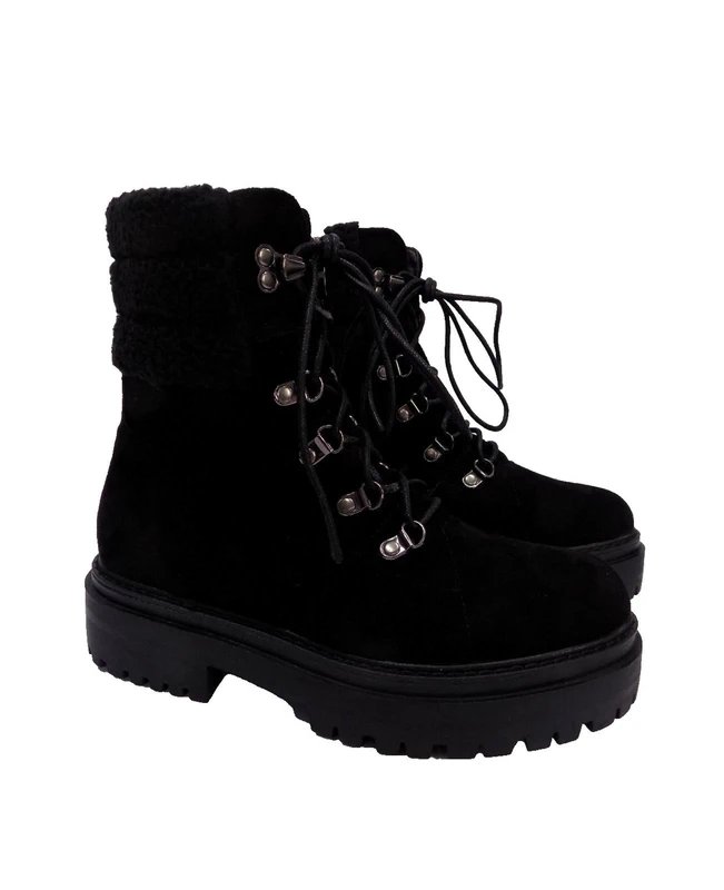 The Retro Biker Combat Ankle Boots in Black is made from faux suede, fabric, synthetic.