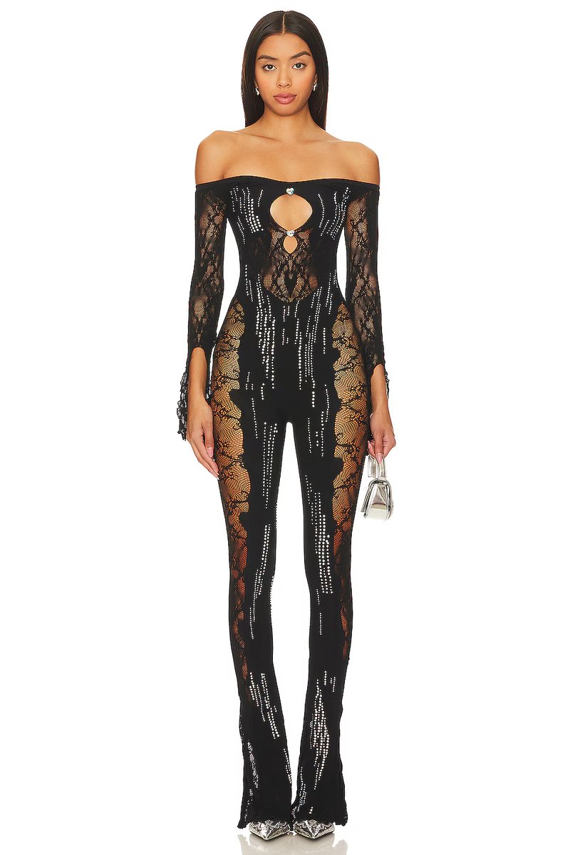Crafted with an off-the-shoulder neckline and long sleeves, this black jumpsuit from Revolve adds a touch of elegance. The lace fabric and sequin details enhance its glamorous appeal, perfect for evening events.