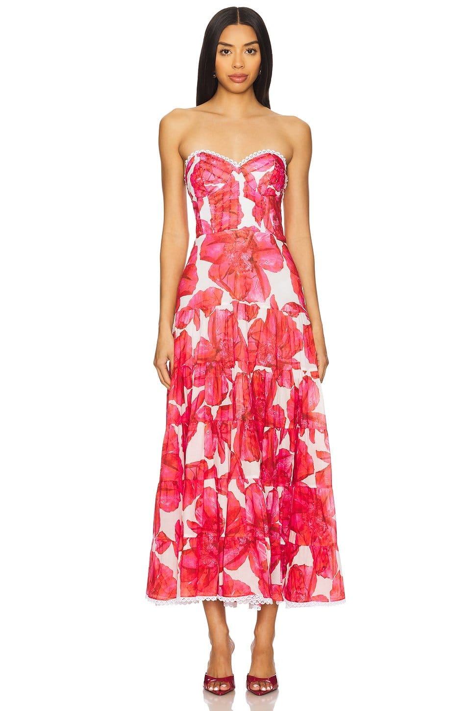 This Charo Ruiz Ibiza long dress features a floral print in vibrant red and white hues. The strapless neckline is adorned with delicate lace trim, and the full skirt has a tiered ruffled design. Ideal for evening events or special occasions.