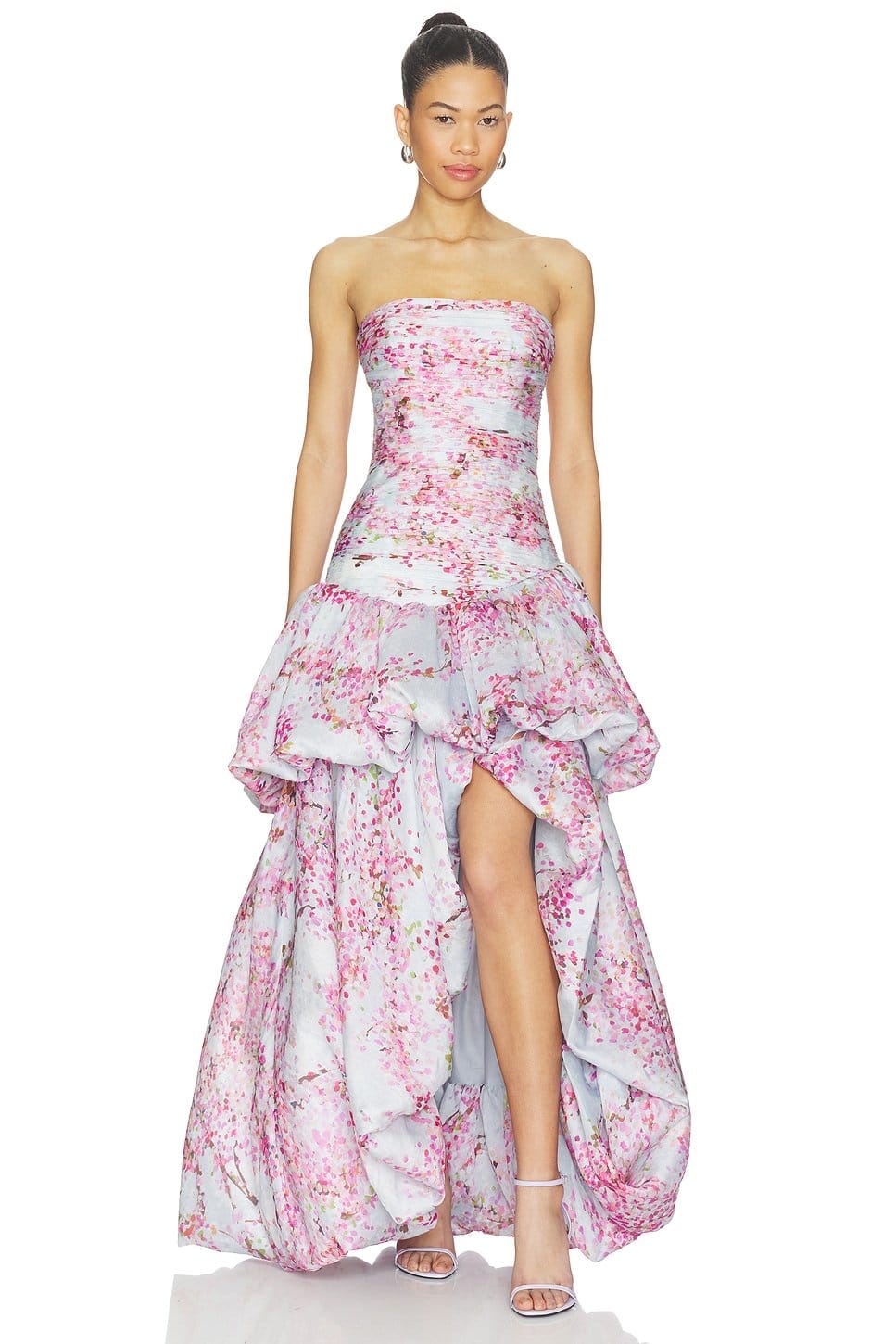 This Cherry Blossom Floral Gown by Aje features a strapless neckline with a corset-style bodice and a full skirt with a high-low hemline. Perfect for special occasions with its elegant and romantic design.