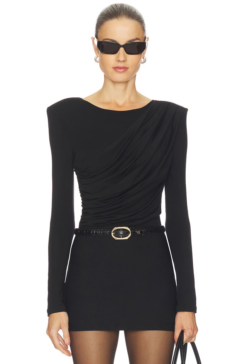 Crafted from black fabric, this long-sleeve bodysuit by Revolve features a scooped neckline and adjustable straps. Perfect for a modern and elegant look.