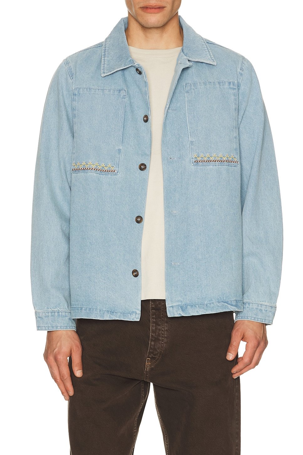 The Revolve Rhythm Long Sleeve Shirt in Stone Blue is made from denim.