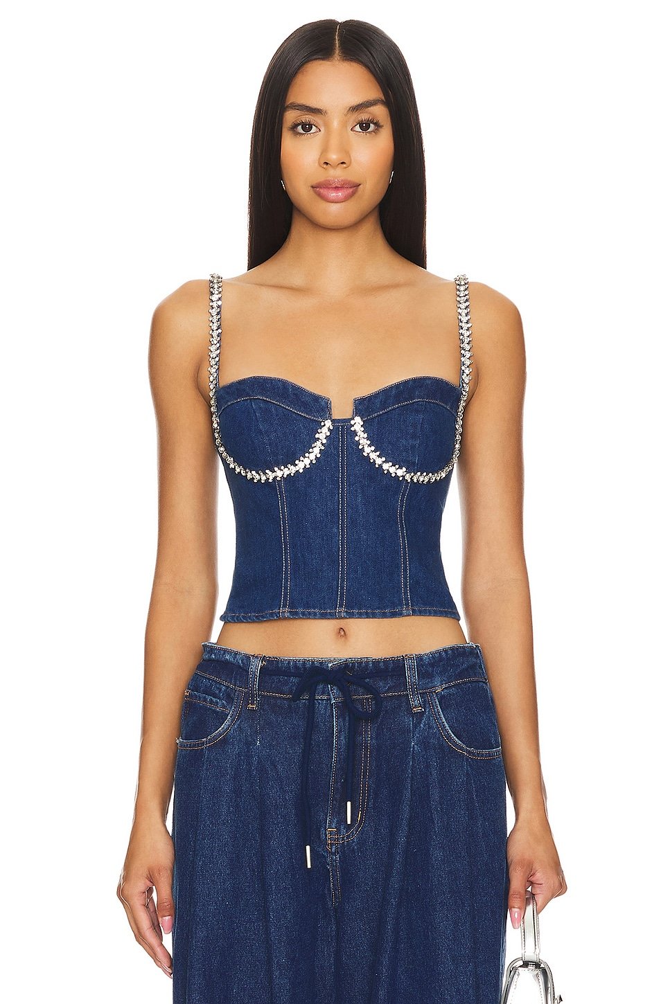 The Revolve Ash Bustier Top in Dark Blue Wash is made from denim, embroidery, studs.