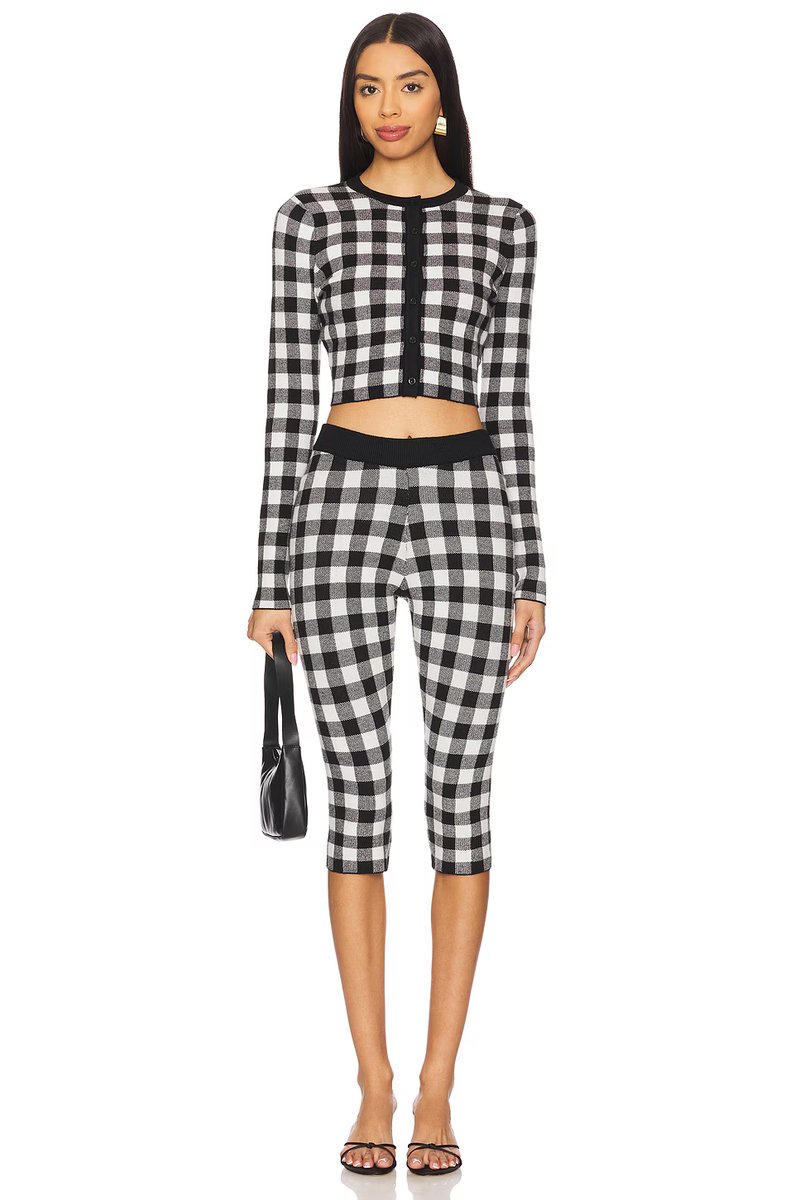 This Ashton Knit Set from Revolve is a stylish ensemble, featuring a long sleeve top and cropped pants. Ideal for a casual look, it is crafted in a black and white checkered knit fabric, offering a unique and trendy aesthetic.
